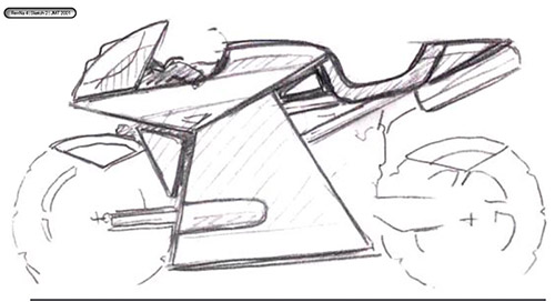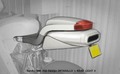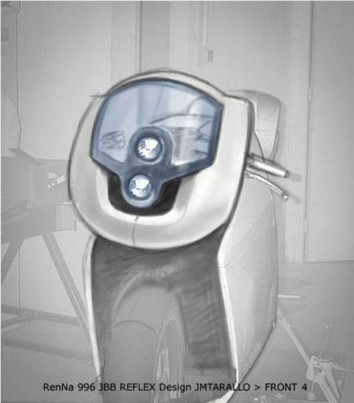Avant la collaboration au projet du designer Jean-Michel Tarallo (JMT), gage d’une cohérence du design et de l’esthétique de la moto en 2001, mon inspiration fût guidée par la cinématique du train avant JBB, s’affaissant plus qu’il ne plonge, pour y introduire une vision aérodynamique avec l’appui d’ailerons avants et arrières, mais la totale inexpérience en ce domaine et l’incapacité financière de tester en soufflerie la cohérence de tels appendices balayèrent très rapidement toute velléité à poursuivre en ce sens. |